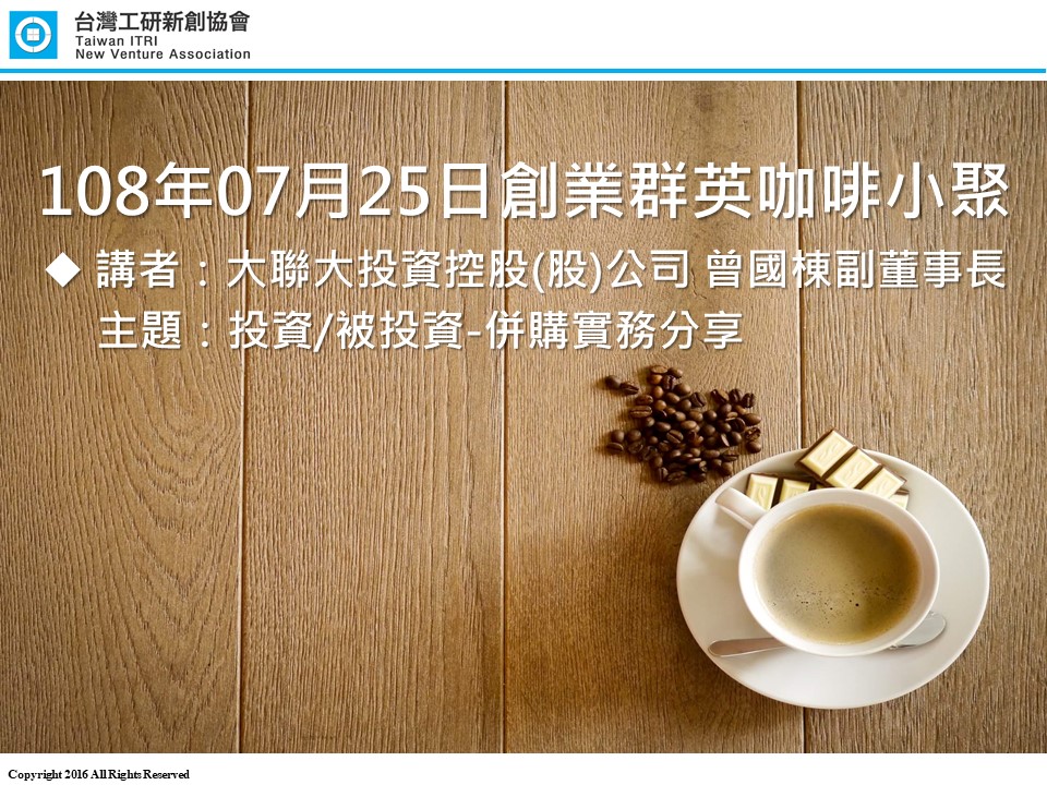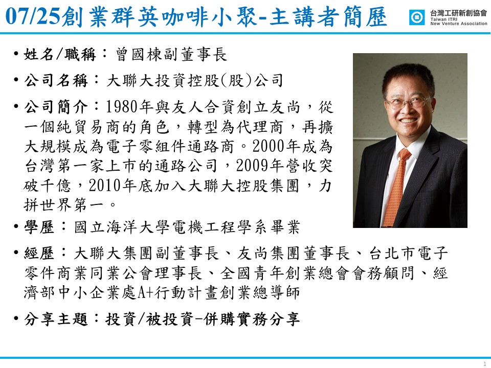 2019年度第七場創業群英咖啡小聚活動將於07/25(四)18:00-20:30舉行,本次特別邀請到大聯大投資控股(股)公司 曾國棟副董事長 分享「投資/被投資-併購實務分享」議題,曾副董創業初期便立下了「無私分享」的人生目標,非常重視教育訓練,在業界有相當多的授課經驗,內容絕對精彩可期且席次有限,本活動採會員優先參加,額滿為止,歡迎報名。