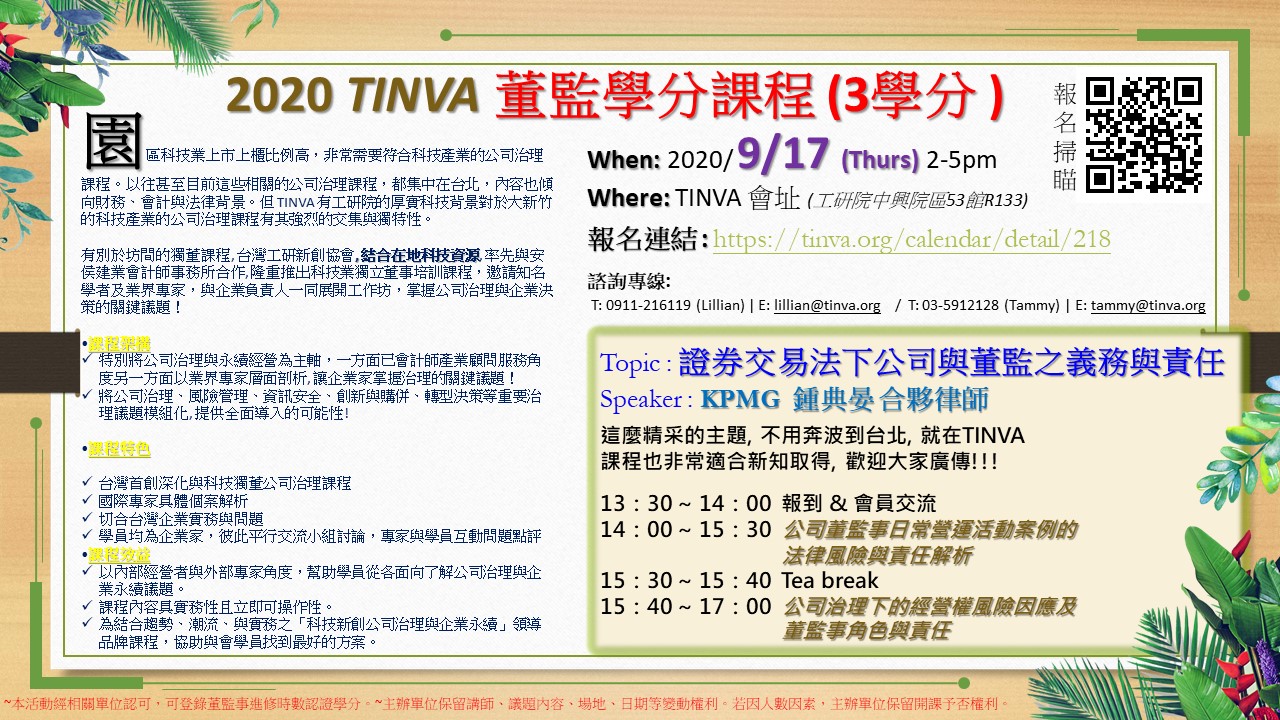 - 新竹科學園區科技業廠商上市上櫃比例高,非常需要符合科技產業的公司治理課程。以往, 甚至目前這些相關的公司治理課程,都集中在台北,內容也傾向財務、會計與法律背景。但 TINVA 有工研院的厚實科技背景對於大新竹的科技產業的公司治理課程有其強烈的交集與獨特性。