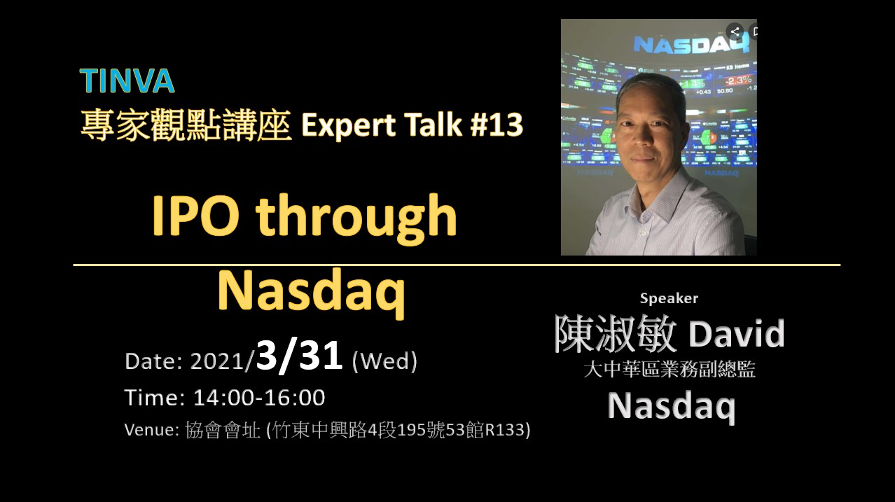 才於日前 (2/25) 為大家演示台灣的 創新板, 戰略新板 (https://tinva.org/calendar/detail/309), 只有TINVA能做到!!! 我們隨後馬上邀請 Nasdaq 大中華區投資副總監與大家分享剖析在 Nasdaq IPO 是夢嗎 ???