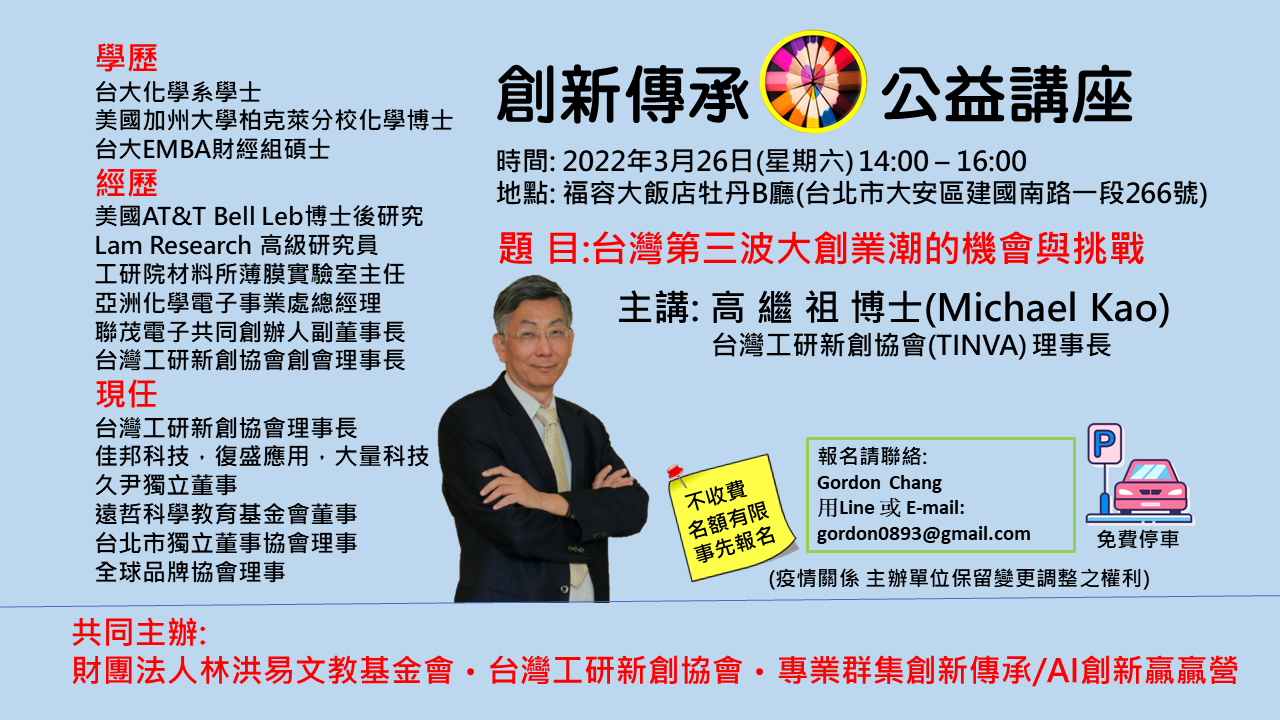 【新創公益講座 】台灣第三波創業潮的機會與挑戰 (台北) 3/26