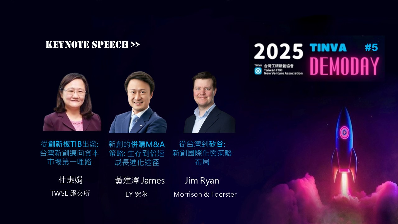 今年活動特邀三位重量級主講者,提供新創全球發展的關鍵資訊:台灣證券交易所以: 從創新板TIB出發: 台灣新創邁向資本市場第一哩路, 剖析創新板上市機會與未來新創融資途徑,協助新創放眼資本市場。安永聯合會計師事務所以新創的併購策略: 生存到倍速成長進化途徑, 深入解析併購趨勢與企業成長途徑,從投資人視角看新創價值. Jim Ryan, Foerster & Morrison 分享從台灣到矽谷: 新創國際化與策略布局, 以豐富跨境經驗,分享臺灣新創進軍美國市場的法律與募資策略.
