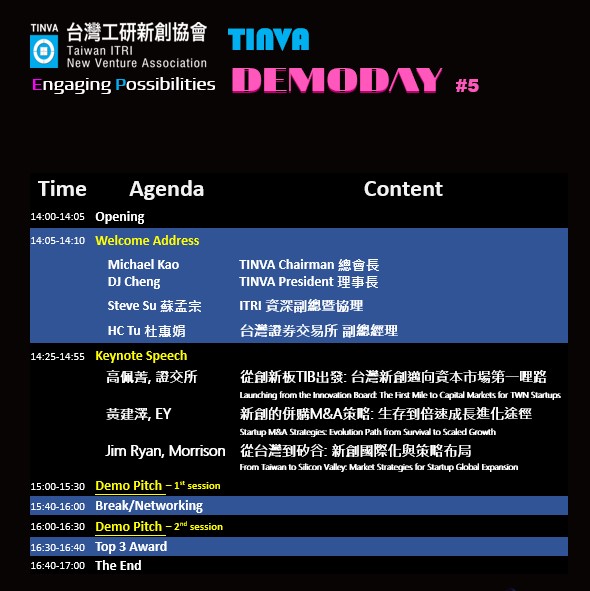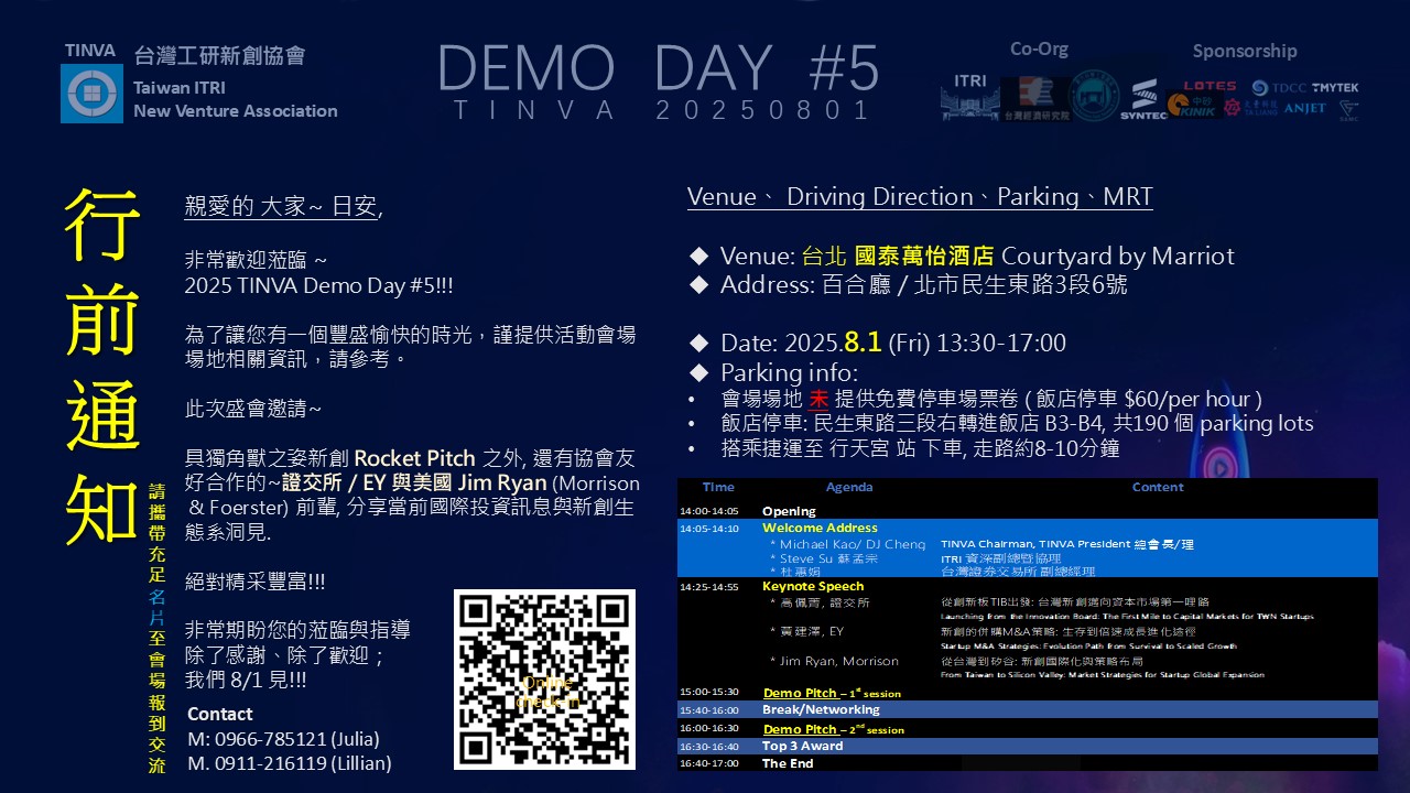 無論您是投資者、創業家還是業界專業人士,這場TINVA Demo Day是我們強烈推薦您參與的盛會!無須任何費用 for 報名參與,點擊連結立即報名,共同參與這場創新盛會!