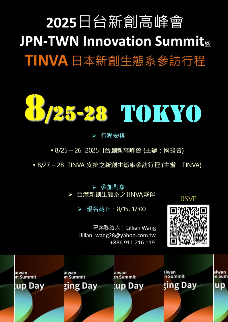 為強化台灣與日本新創生態系的交流合作,TINVA 將於2025年8月25日至26日帶領台灣新創團隊參與由台灣的 國家發展委員會主辦,於東京舉行的「第三屆2025日台創新高峰會」。這是我們第二次參與此國際新創盛會,亦是鏈結日本創投與新創資源的重要年度行動。去年高峰會促成多項後續合作,成效卓著。