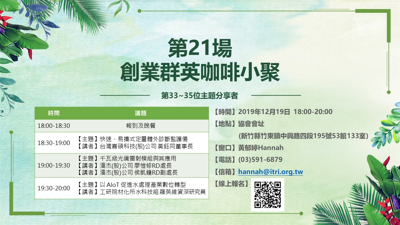 今年度壓軸登場的第21場創業群英咖啡小聚活動將於12/19(四)18:00-20:00舉行,本場次邀請到三個不同領域的講者做分享,相關資訊如下,機會難得,歡迎有興趣的會員們踴躍報名參與。
