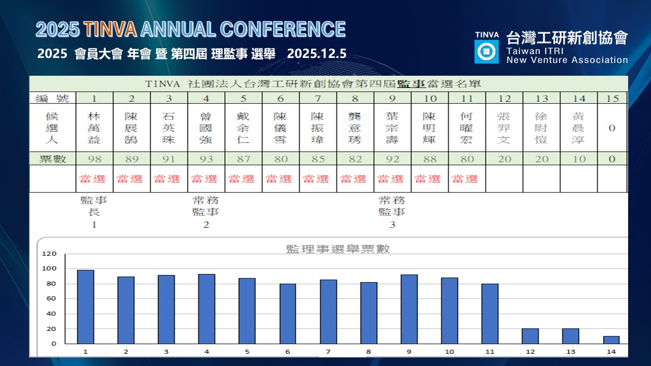 TINVA 社團法人台灣工研新創協會第四屆 監事當選 名單